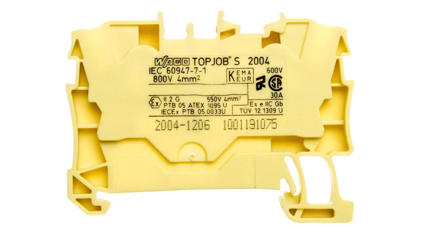 złączka przelotowa 2-przewodowa; 4 mm²; do zastosowań Ex e II; opis z boku i na środku; na szynę TS 35 x 15 i 35 x 7,5; Push-in CAGE CLAMP®; 4,00 mm²; żółty