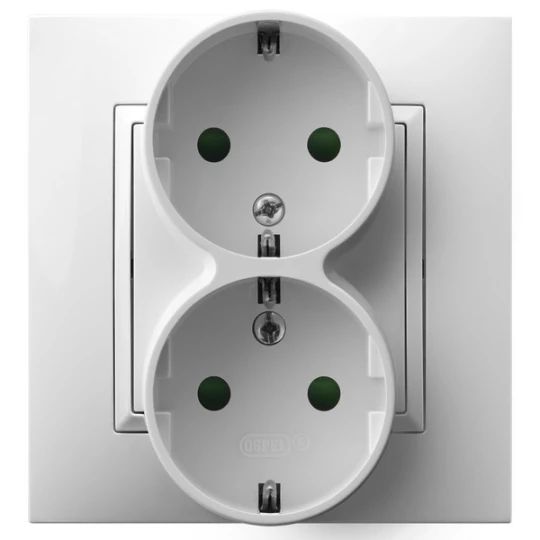 Gniazdo podwójne z uziemieniem schuko z przesłonami torów prądowych, kompletne z ramką, biały ARIA o numerze katalogowym GP-2USP/00 w kategorii Gniazda podtynkowe, Gniazda instalacyjne. Produkt wyprodukowany przez markę OSPEL, seria ARIA.