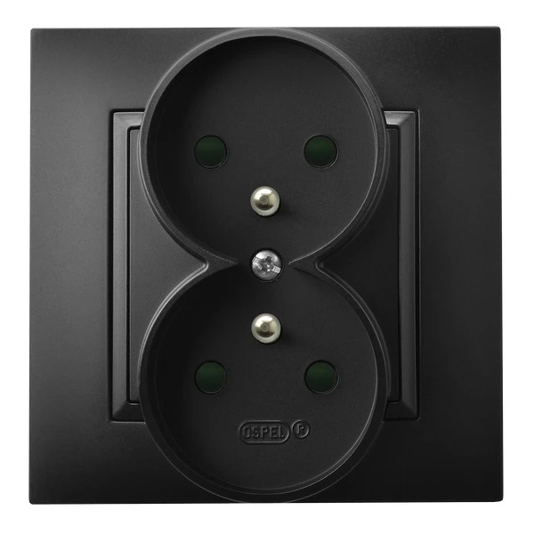 Gniazdo podwójne z uziemieniem z przesłonami torów prądowych, kompletne z ramką, czarny metalik ARIA o numerze katalogowym GP-2UZP/33 w kategorii Gniazda podtynkowe, Gniazda instalacyjne. Produkt wyprodukowany przez markę OSPEL, seria ARIA.