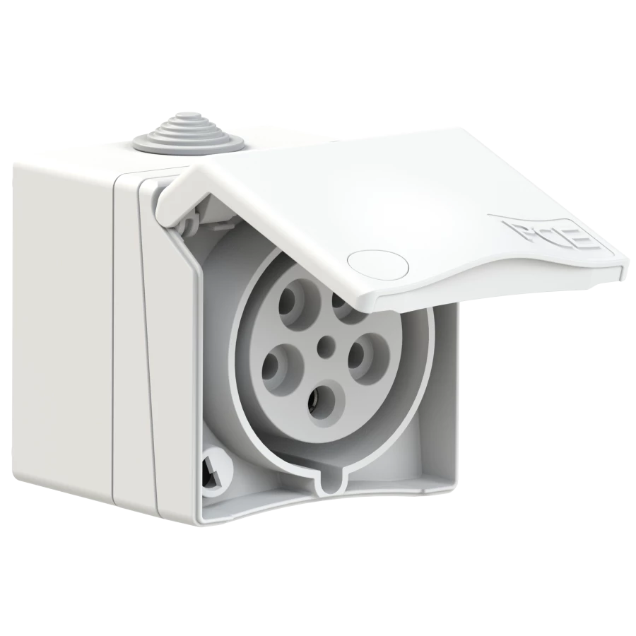 Gniazdo nadtynkowe przelotowe zabudowane seria Design 32A 3P+Z+N 400V IP44 o numerze katalogowym 875-6V w kategorii Gniazda stałe, Gniazda siłowe. Produkt wyprodukowany przez markę PCE, seria DESIGN.