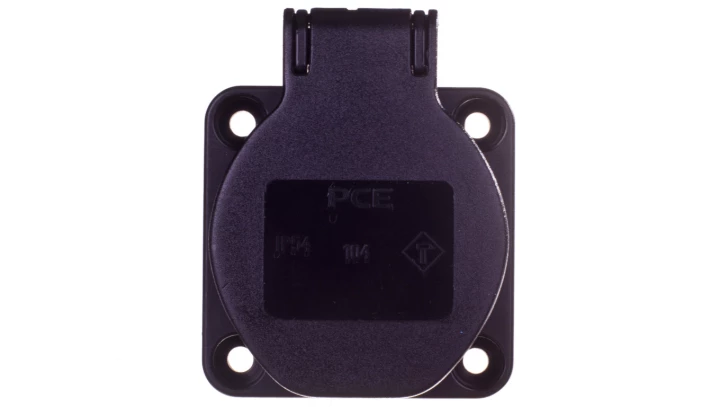 Gniazdo tablicowe jednofazowe P-Nova 16A 2P+Z 230V, kołnierz 50x50, z bolcem, czarne, boczne wprowadzenie przedowdu IP54 o numerze katalogowym 104-0SS w kategorii Gniazda tablicowe, Gniazda siłowe. Produkt wyprodukowany przez markę PCE, seria P-NOVA.