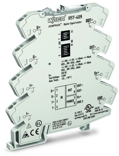 przetwornik separacyjny ze wzmocnieniem; bipolarny prądowy i napięciowy sygnał wejściowy; bipolarny prądowy i napięciowy sygnał wyjściowy; kalibracja zera/zakresu; konfiguracja przy pomocy mikroprzełączników DIP; napięcie zasilania 24 V DC; szerokość 6 mm; 2,50 mm²