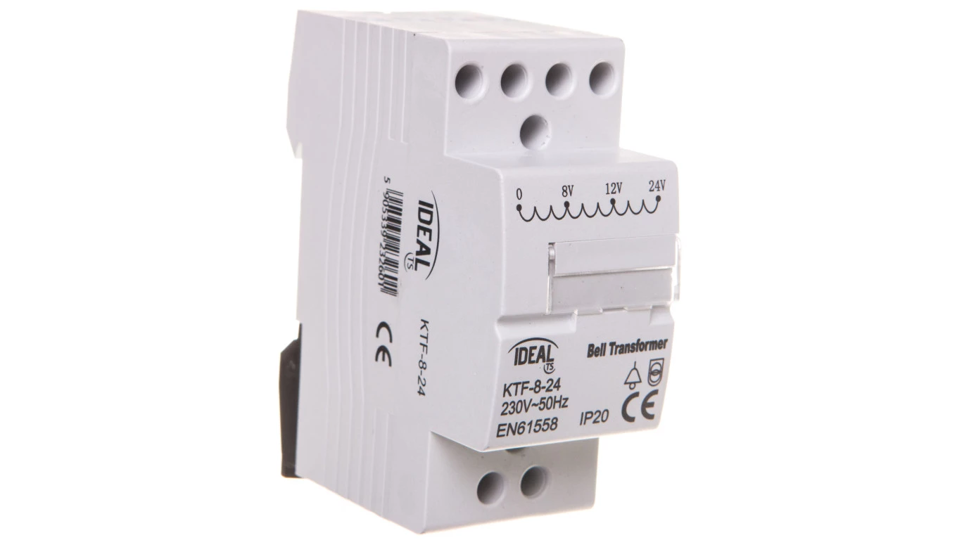 Transformator dzwonkowy na szynę TH35, KTF-8-24 o numerze katalogowym   23260 w kategorii Aparatura sterująca>Zasilacze i transformatory. Produkt wyprodukowany przez markę IDEAL.