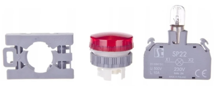 Lampka sygnalizacyjna 22mm czerwona 230V AC SP22-LC-230-BA9S.