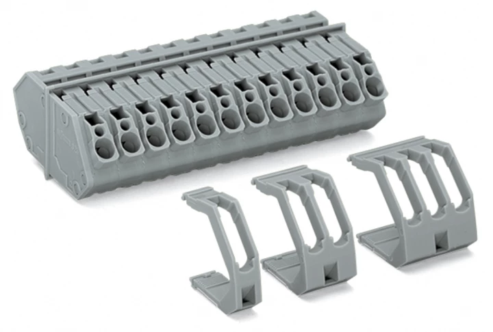złącze przepustowe; połączenie przewód/przewód; grubość blachy 1 … 4 mm; 4 mm²; raster 7 mm; 3-bieg.; CAGE CLAMP®; 4,00 mm²; szary