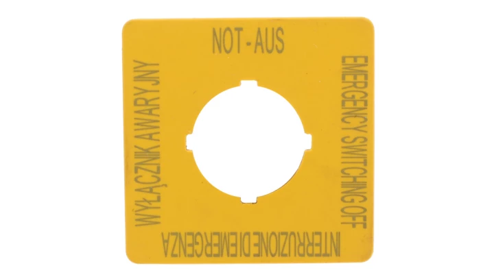M22-XYK5 TABLICZKA OPISOWA KWADRATOWA 50X50 "WYŁĄCZNIK BEZPIECZEŃSTWA" PL/ EN/ DE/ IT ŻÓŁTY