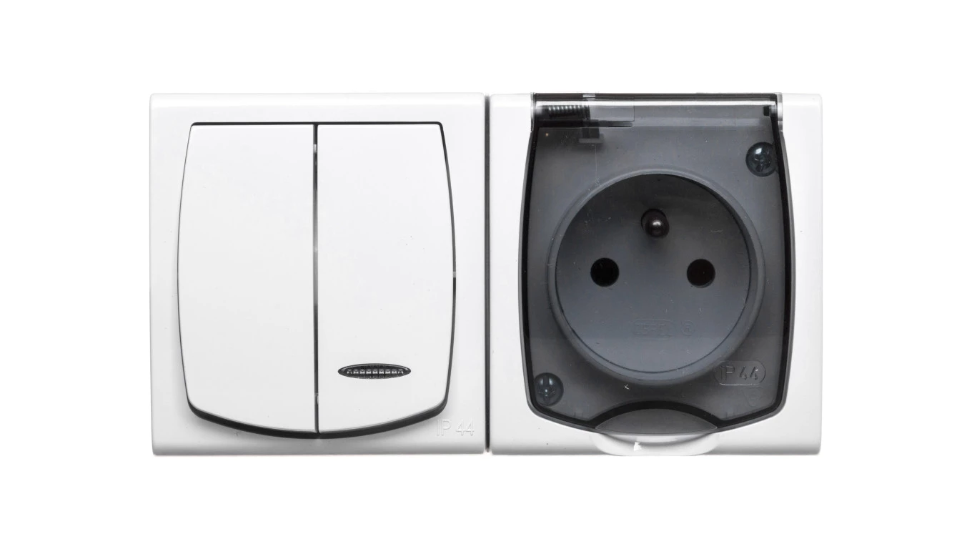 MADERA BIAŁY GNIAZDO NT 1X Z/U Z KLAPKĄ BIAŁĄ + ŁĄCZNIK NT 1-BIEGUNOWY ZACISKI ŚRUBOWE 16A 250V IP44