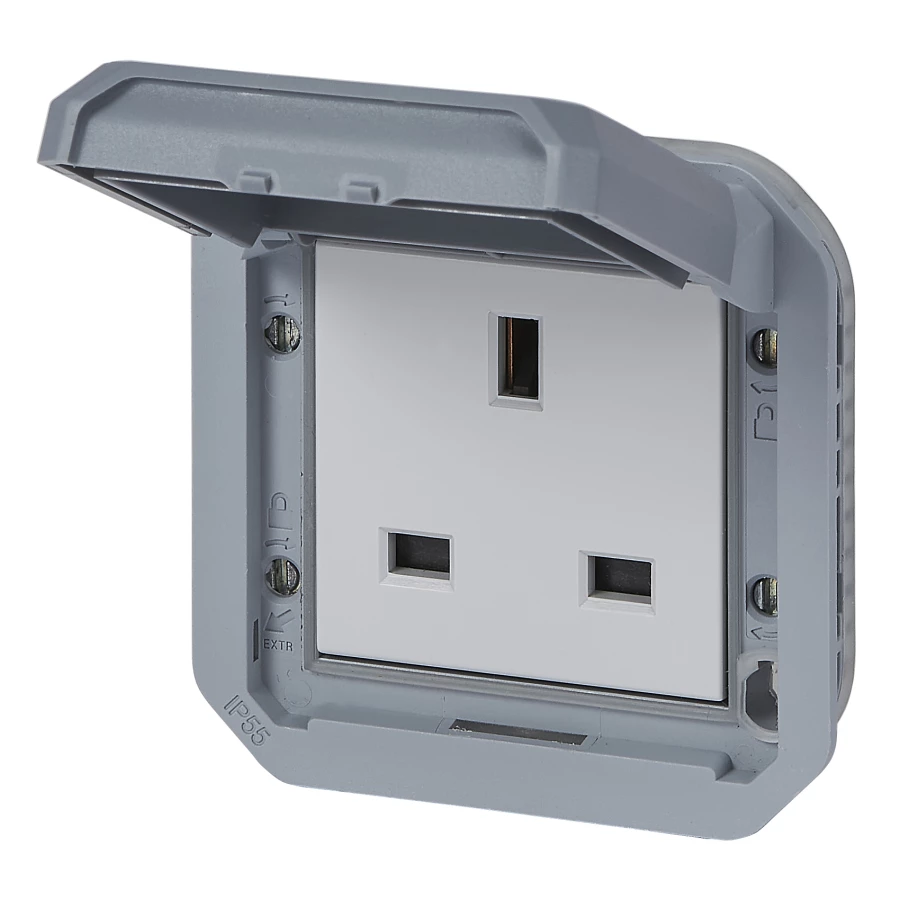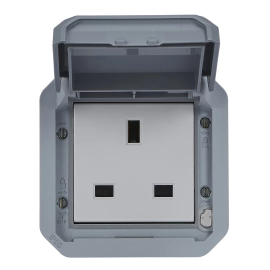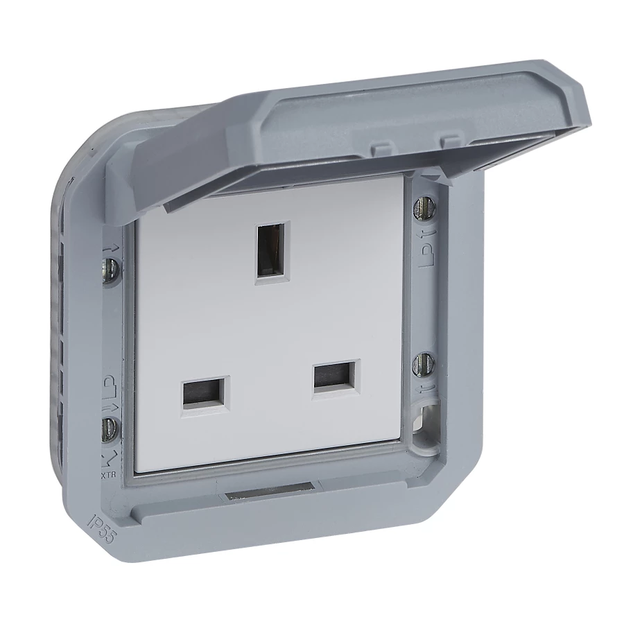Gniazdo pojedyncze z uziemieniem standard brytyjski 2P+Z, zaciski śrubowe, mechanizm 13A-250V~ - szare, NOWE PLEXO 55 o numerze katalogowym   069585L w kategorii Gniazda podtynkowe>Gniazda natynkowe. Produkt wyprodukowany przez markę LEGRAND, seria NOWE PLEXO55.