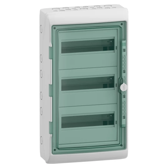 Obudowa natynkowa Mureva (dawna Kaedra) IP65 MRV-3-12-NT-T drzwi transparentne 3 rzędy 12 modułów/rząd o numerze katalogowym   13435 w kategorii Rozdzielnice i obudowy>Tworzywowe natynkowe. Produkt wyprodukowany przez markę SCHNEIDER ELECTRIC.