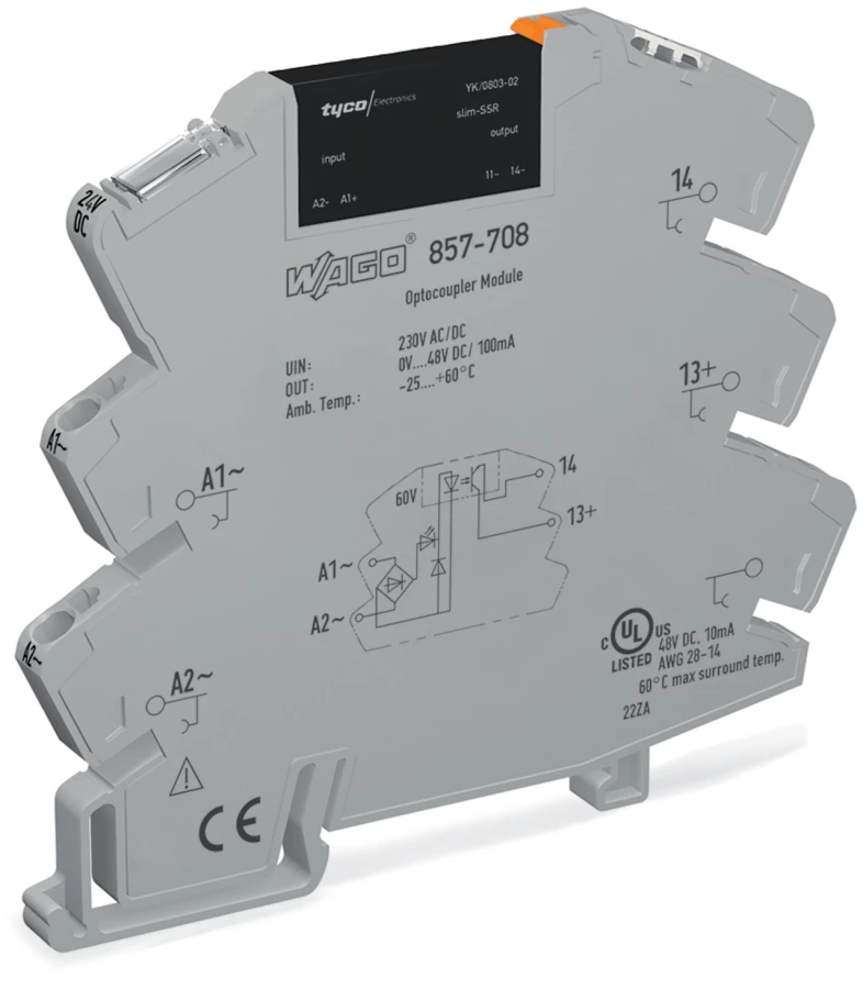 przekaźnik półprzewodnikowy; znamionowe napięcie wejściowe 230 V AC/DC; zakres napięcia wyjściowego 0 … 48 V DC; maksymalny prąd długotrwały 0,1 A; podłączanie 2-przewodowe; sygnalizacja statusu żółta; szerokość 6 mm; szary