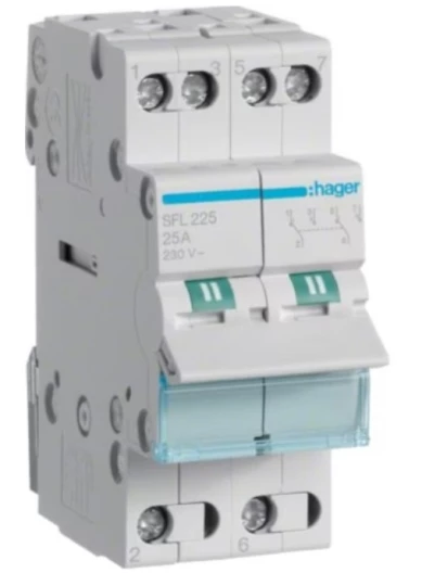 Przełącznik instalacyjny modułowy I-II punkt wspólny od dołu 2P 25A 230VAC o numerze katalogowym SFL225 w kategorii Pozostałe, Niesklasyfikowane..