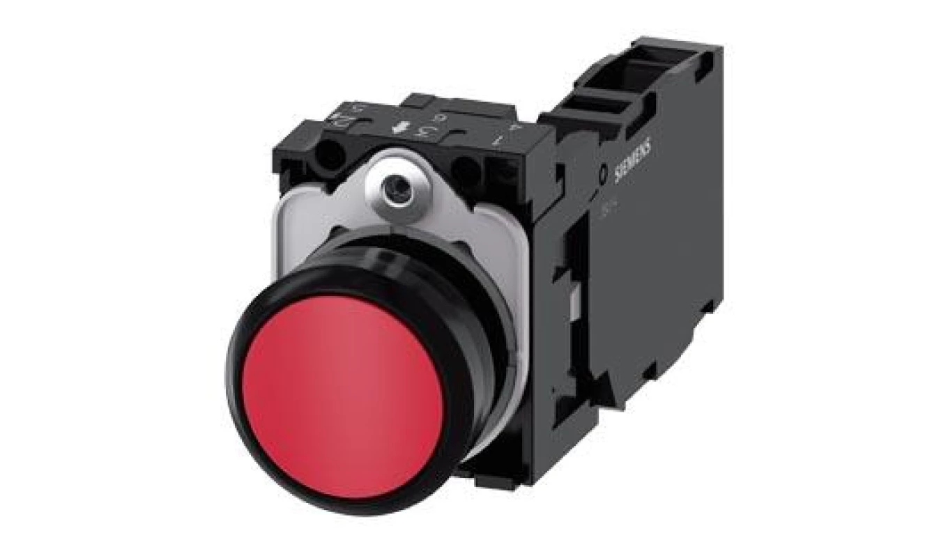 Przycisk 22 mm okrągły plastikowy czerwony płaski ze stykiem chwilowym z uchwytem 1 NO+1 NC 3SU1100-0AB20-1FA0