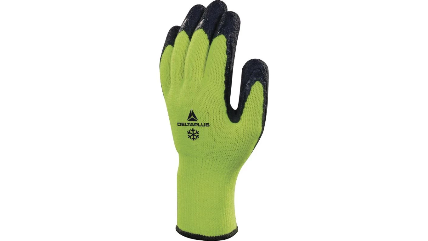 Rękawice dziane z akrylu, dłoń powlekana pianką Lateksową, ścieg 10 żółty fluo-czarny 9 o numerze katalogowym VV735JA09 w kategorii Rękawice wzmacniane, Ochrona rąk. Produkt wyprodukowany przez markę DELTA PLUS, seria APOLLON WINTER VV735.