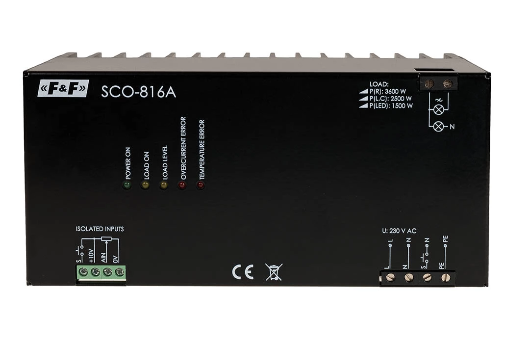 Ściemniacz do odbiorników dużej mocy 3500w, zasilanie 230v z wejściem analogowym 1-10v SCO-816A o numerze katalogowym SCO-816A w kategorii Pozostałe ściemniacze, Ściemniacze i czujniki. Produkt wyprodukowany przez markę F&F.