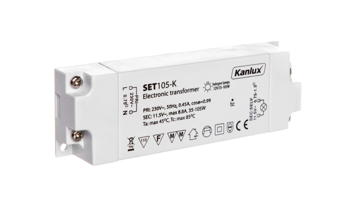 Transformator elektroniczny SET SET105-K o numerze katalogowym   1426 w kategorii Zasilanie oświetlenia>Zasilacze do LED. Produkt wyprodukowany przez markę KANLUX.