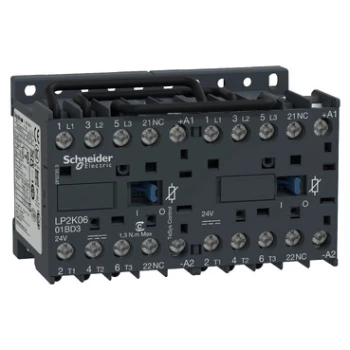 Stycznik nawrotny TeSys K, 6A, 3P, 1NC, cewka 24VDC, zaciski skrzynkowe o numerze katalogowym   LP2K0601BD3 w kategorii Styczniki>Styczniki typ DC. Produkt wyprodukowany przez markę SCHNEIDER ELECTRIC, seria TESYS K.