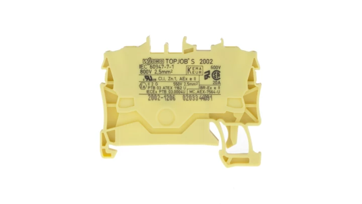 złączka przelotowa 2-przewodowa; 2,5 mm²; do zastosowań Ex e II; opis z boku i na środku; na szynę TS 35 x 15 i 35 x 7,5; Push-in CAGE CLAMP®; 2,50 mm²; żółty