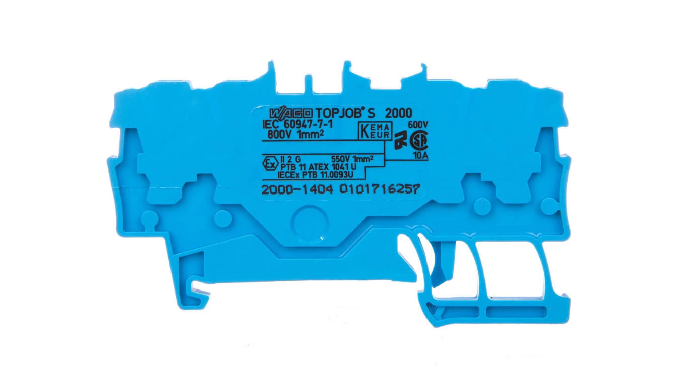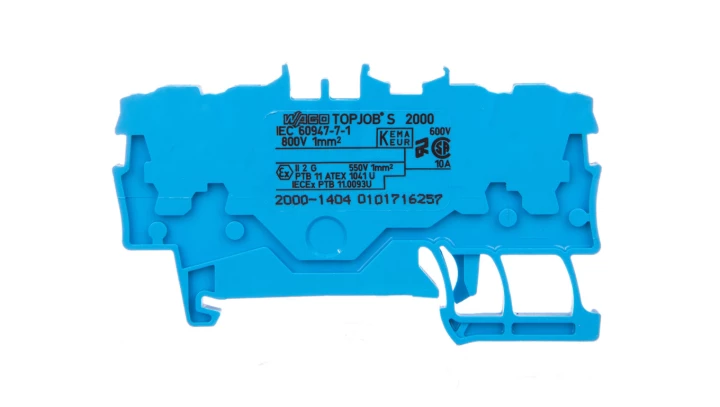 złączka przelotowa 4-przewodowa; 1 mm²; do zastosowań Ex e II oraz Ex i; opis z boku i na środku; na szynę TS 35 x 15 i 35 x 7,5; Push-in CAGE CLAMP®; 1,00 mm²; niebieski
