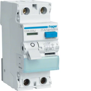 Wyłącznik różnicowoprądowy 25A, 30mA, 2 biegunowy, typ A o numerze katalogowym CDA225J w kategorii Wyłączniki różnicowoprądowe typ A, Wyłączniki różnicowoprądowe. Produkt wyprodukowany przez markę HAGER.
