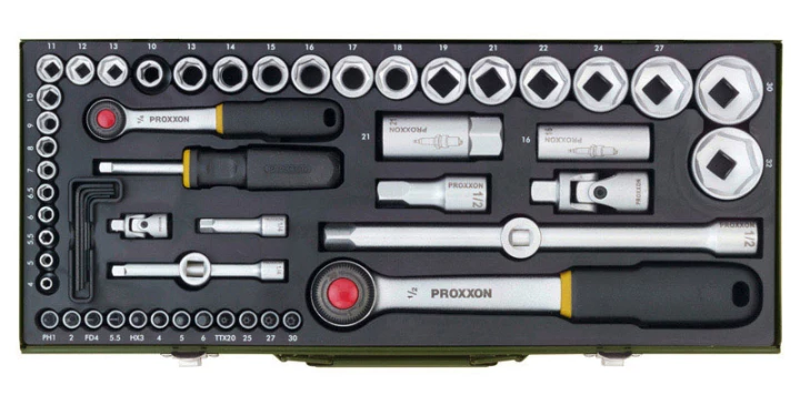 Zestaw kluczy nasadowych Proxxon 1/2 i 1/4 cala [56 cz.] o numerze katalogowym   PR23040 w kategorii Klucze>Klucze nasadowe. Produkt wyprodukowany przez markę PROXXON.