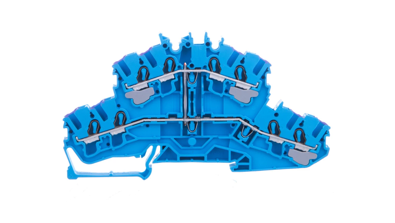 złączka 2-piętrowa 4-przewodowa; złączka przelotowa 8-przewodowa; N; bez podstawki oznacznika; do zastosowań Ex i; z mostkowaniem wewnętrznym; otwory na przewody z fiolet. nadrukiem; na szynę TS 35 x 15 i 35 x 7,5; 2,5 mm²; Push-in CAGE CLAMP®; 2,50 mm²; niebieski