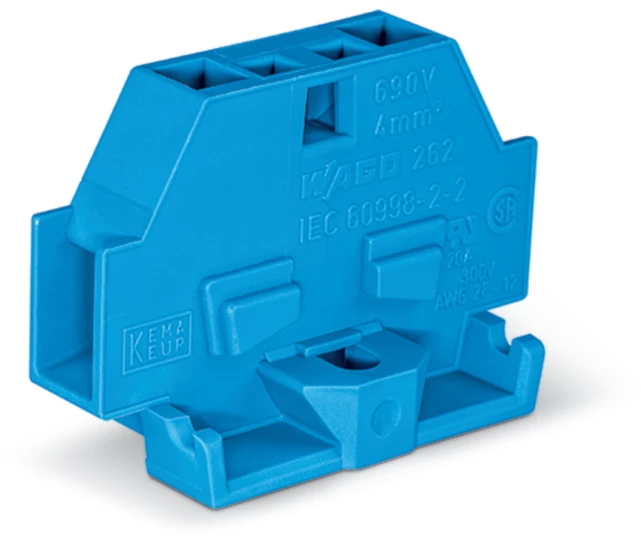 złączka 2-przewodowa; bez przycisków; do zastosowań Ex i; z uchwytem montażowym; 1-bieg.; do mocowania śrubowego i podobnego typu; otwór montażowy Ø 3,2 mm; 4 mm²; CAGE CLAMP®; 4,00 mm²; niebieski