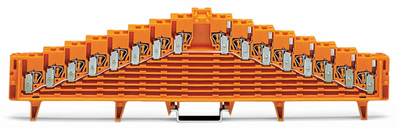 złączka potencjałowa 8-piętrowa; bez zatrzasków; wszystkie zaciski zmostkowane wew.; z otworem pomiarowym Ø 2,3 mm; na szynę TS 35 x 15; 1,5 mm²; pomarańczowy
