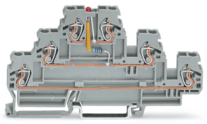złączka do zabudowy elementów; 3-piętr.; LED czerwona; 24 V DC; na szynę TS 35 x 15 i 35 x 7,5; 2,5 mm²; CAGE CLAMP®; szary