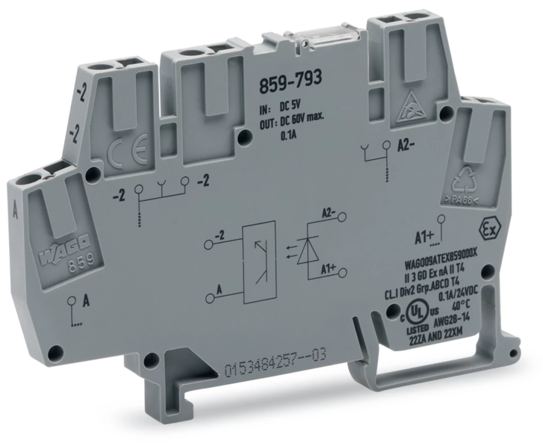 optoseparator; znamionowe napięcie wejściowe 5 V DC; zakres napięcia wyjściowego 3 … 60 V DC; maksymalny prąd długotrwały 0,1 A; podłączanie 2-przewodowe; kolejnictwo; szerokość 6 mm; szary
