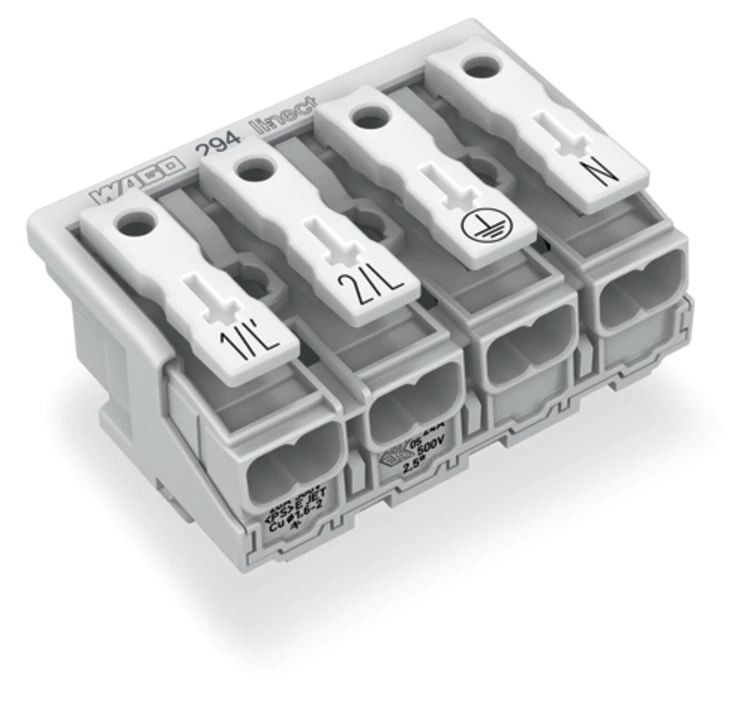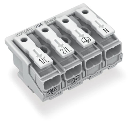 złączka zasilająca; przyciski: od strony zewn.; do Linect®; bez styku PE; 1/L-2/L-PE-N; 4-bieg.; kodowanie A; od strony oprawy: do przew. jednodr.; od strony inst.: do wsz. rodz. przewodów; maks. 2,5 mm²; temperatura otoczenia maks. 85°C (T85); biały