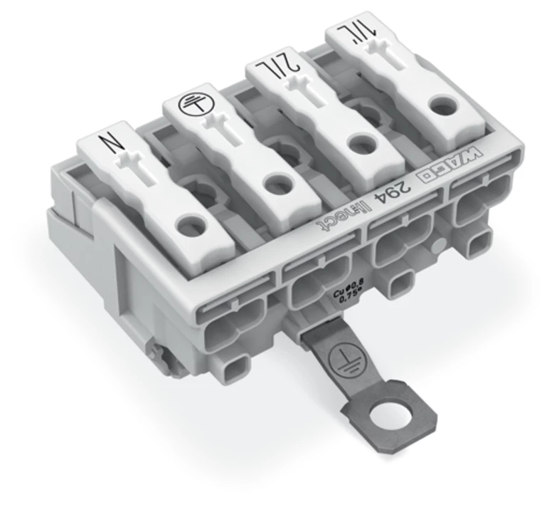 złączka zasilająca; przyciski: od strony zewn.; do Linect®; ze śrubowym stykiem PE; 1/L-2/L-PE-N; 4-bieg.; kodowanie A; od strony oprawy: do przew. jednodr.; od strony inst.: do wsz. rodz. przewodów; maks. 2,5 mm²; temperatura otoczenia maks. 85°C (T85); biały