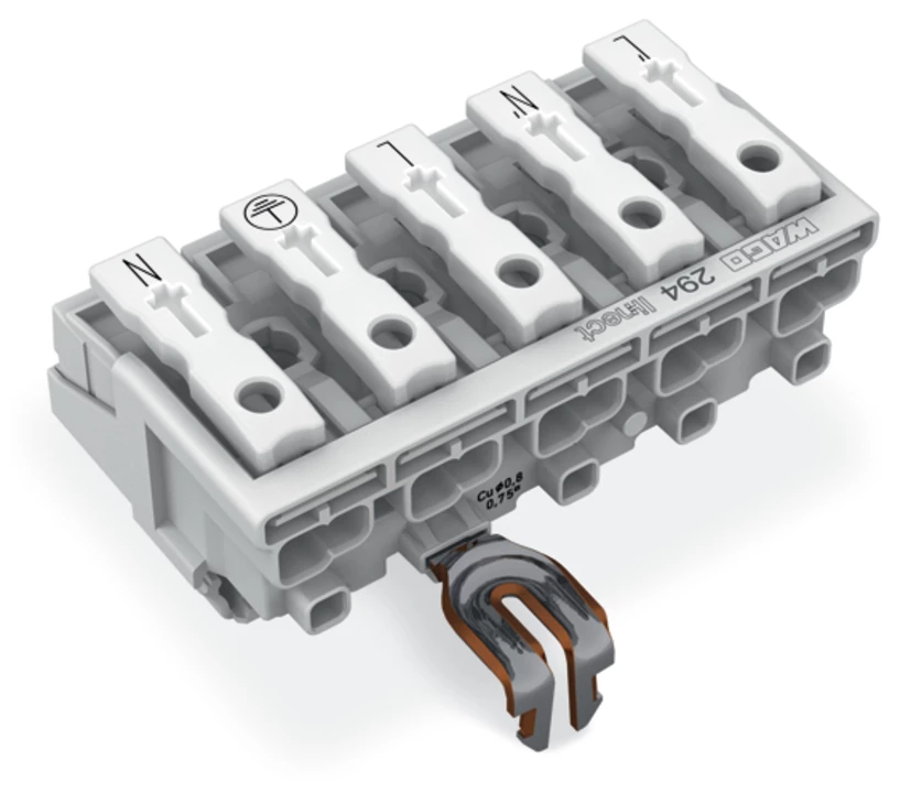 złączka zasilająca; przyciski: od strony zewn.; do Linect®; z zatrzaskowym stykiem PE; L-N-L-PE-N; 5-bieg.; kodowanie L; od strony oprawy: do przew. jednodr.; od strony inst.: do wsz. rodz. przewodów; maks. 2,5 mm²; temperatura otoczenia maks. 85°C (T85); biały